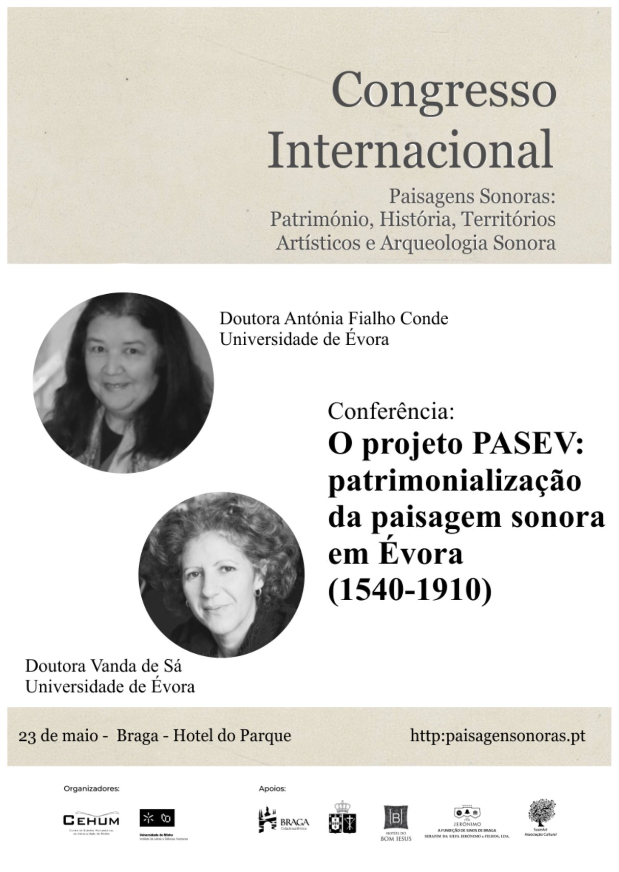 As investigadoras Vanda de Sá e Antónia Fialho Conde e o investigador António Camões Gouveia irão participar no Congresso Internacional “Paisagens Sonoras: Património, História, Territórios Artísticos e Arqueologia Sonora”, que decorrerá entre 23 e 25 de maio próximos no Hotel do Parque e Hotel do Elevador do Bom Jesus do Monte, em Braga.